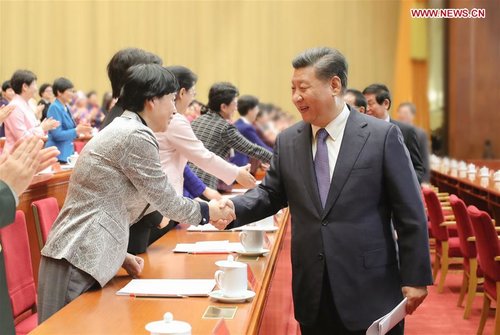 Chinese President Xi Jinping, also general secretary of the Communist Party of China (CPC) Central Committee and chairman of the Central Military Commission, shakes hands with delegates to the 12th National Women's Congress (NWC) in Beijing, capital of China, Oct. 30, 2018. [Xinhua/Ju Peng]