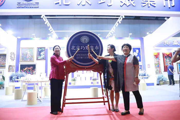 Zhou Jing, a first-level Inspector of the BWF, Han Guihua, head of the Women’s Development Department of the BWF, and Xia Hua, Chairman of the BQHDA and the Eve Group, jointly beat a drum to open the handicrafts fair. [Beijing Women's Federation]