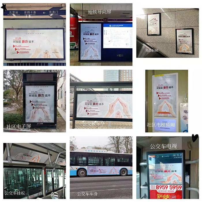 To mark the International Day for the Elimination of Violence against Women, which falls on November 25, Beijing Women's Federation launched a city-wide anti-domestic violence campaign by putting up informative posters and billboards in areas with a large flow of people and good visibility. More than 20,000 posters or video clips were placed and broadcast at bus shelters, mobile TVs on 550 bus lines in downtown Beijing, light boxes and elevator TVs in 51 communities, and the large screens of Joy City Mall in Chaoyang District and other malls. People will easily see the posters on buses, as well as escalators, TV screens and light boxes of subways. This action is expected to call on all sectors of society to fulfill their responsibility in caring for families and fighting domestic violence.