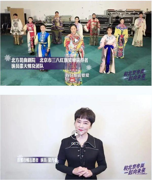 Shao Tianshuai, an artist from the Northern Kunqu Opera Theatre and a winner of Beijing March 8th Red-banner Holder Award and her team, and Liang Danni, an actress and a Capital Woman volunteer, participate in a singing activity for the upcoming Beijing Winter Olympics.