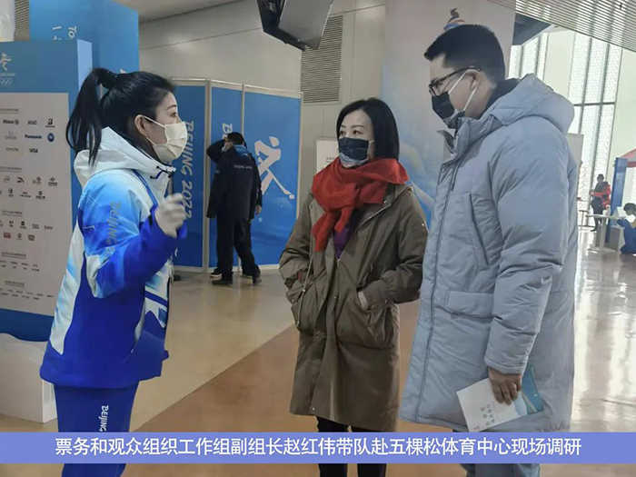 Zhao Hongwei, deputy head of the ticket and spectator organization team of BWF’s special working group, inspects work at the Beijing Wukesong Sports Center.