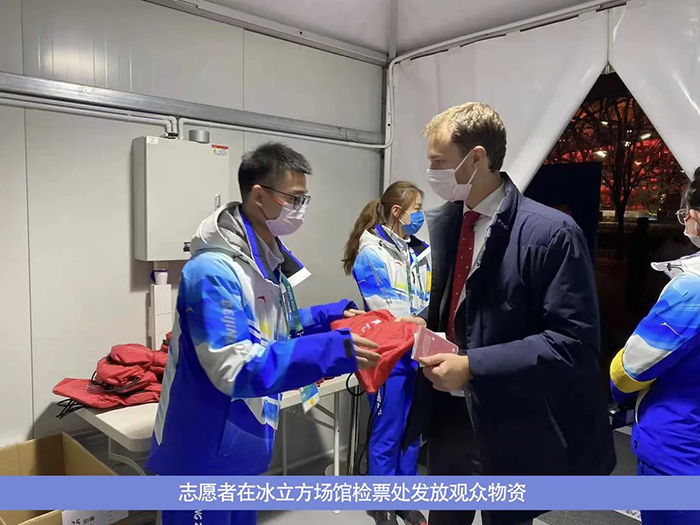 Volunteers distribute gifts to spectators at the National Aquatics Center or “Ice Cube.”