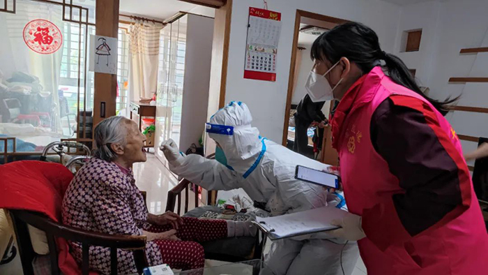 A medical worker take a swab sample from an elderly resident for a nucleic acid test at the elderly’s home.