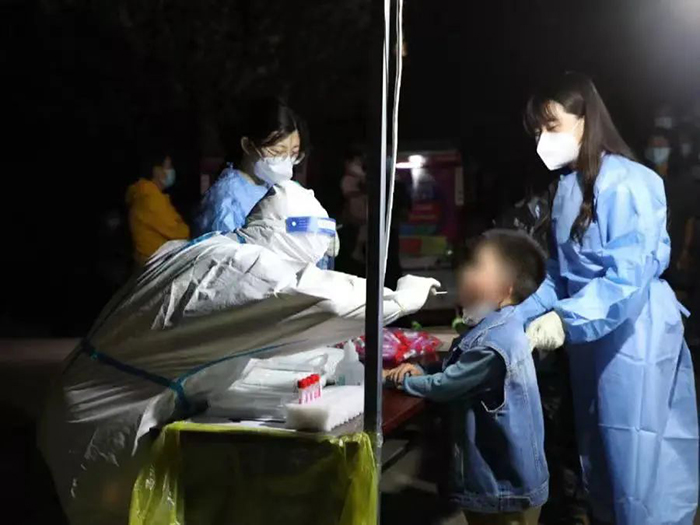 A child takes nucleic acid test at a testing site in Tongzhou District.