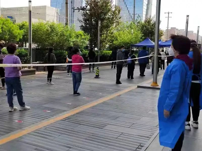 Cui Jiana of Beijing Women Cadres School is responsible for the guidance and order maintenance at the nucleic acid testing site at Wanshou Road No. 8 Neighborhood, in Haidian District.