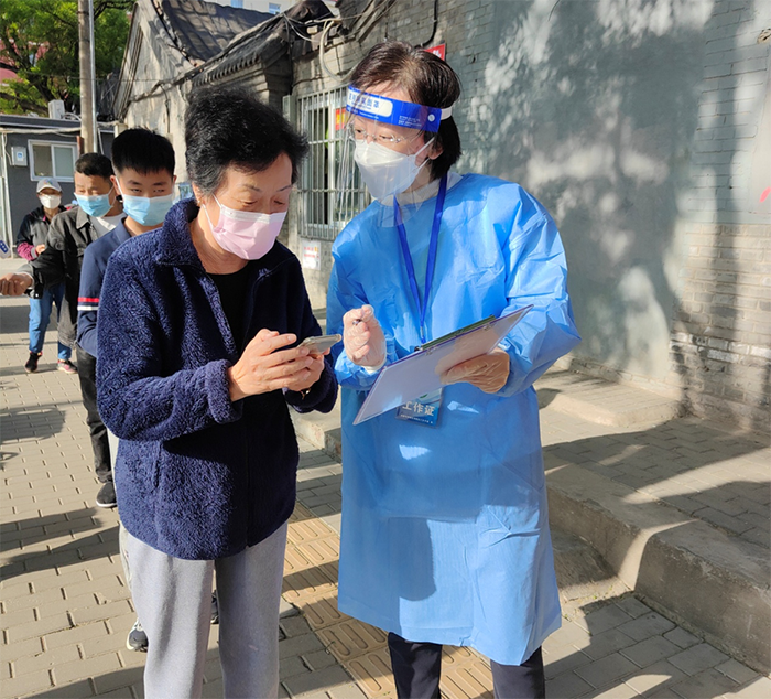 Xu Jingling, from the Beijing Women's Development Research Center, actively volunteered to keep order and register information at a nucleic acid testing site in Xicheng District.