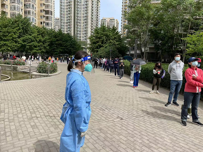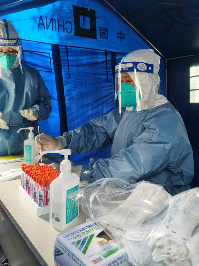 Fan Chen from the Beijing Women's and Children's Service Center assisted in nucleic acid testing in Chaoyang District.