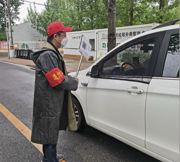 Yang Cheng checks residents’ health codes in Tongzhou District.
