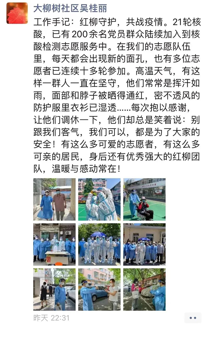 During the past several weeks, she has been writing a frontline diary to record their participation in the epidemic prevention and control, bolstering the morale of her colleagues and expressing thanks to all volunteers for their wisdom and strength in helping conduct mass nucleic acid testing to cut off transmission of the virus.