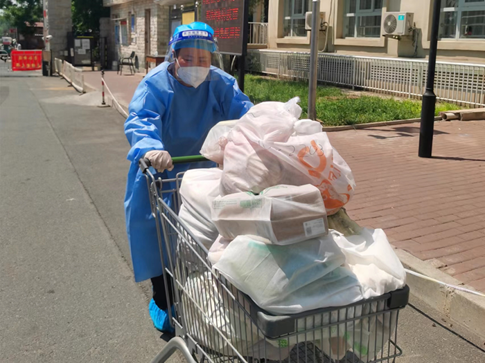Zhao Donghua delivers daily necessities to local residents living in a closed-off management area.