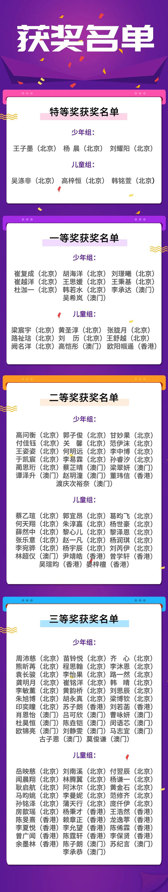 The organizing committee received 3,968 entries from children all across Beijing, Hong Kong and Macao in a span of over two months. A review board decided to present the star prize, the first, the second and the third prizes in the categories of teenagers and children to 127 entries.