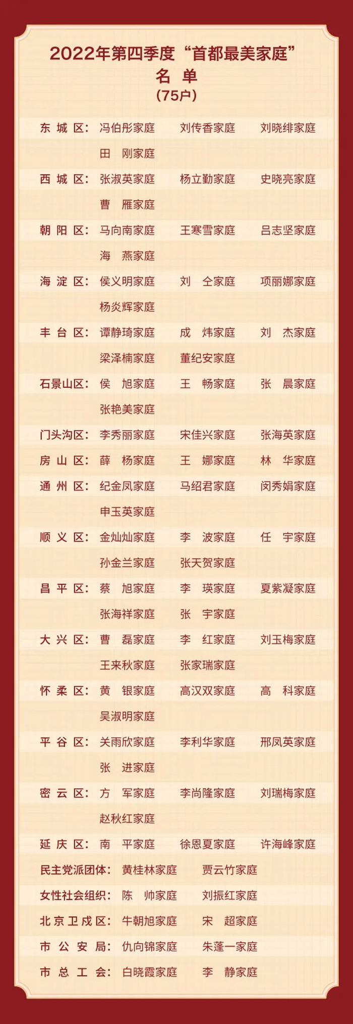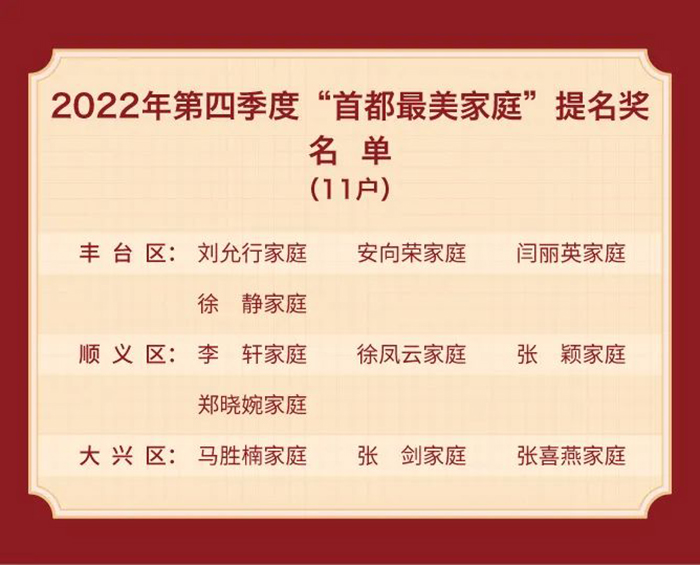 Date:2023-2-22 14:25:03 Views:The Beijing Municipal Commission for Discipline Inspection, the Beijing Municipal Supervisory Commission, the Organization Department of the Beijing Municipal Committee of the Communist Party of China (CPC), the Beijing Municipal Office for Cultural and Ethical Progress, the Beijing Municipal Education Commission and the Beijing Women's Federation recently unveiled the list of recommended families of the Looking for the Most Beautiful Families in the Capital campaign in the fourth season of 2022.