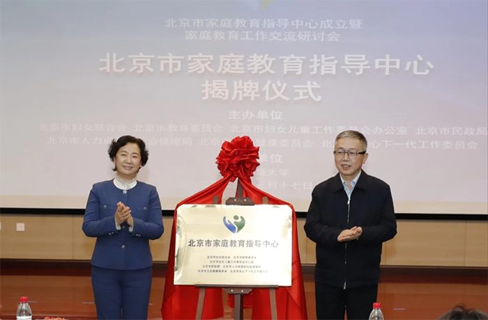 Zhang Yajun (L), secretary of the Leading Party Members' Group and president of the Beijing Women's Federation, and Meng Fanhua, Party secretary of Capital Normal University, jointly unveil the Beijing Family Education Guidance Center.