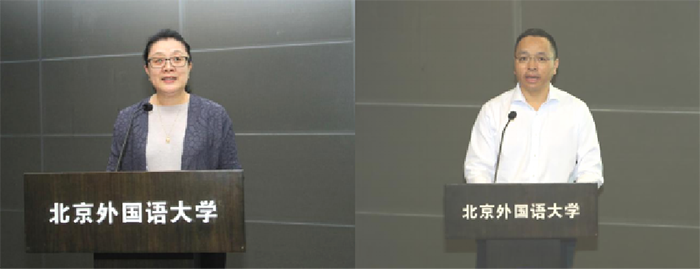 Tan Hong (L), vice-president of the Beijing Women's Federation, and Yang Dan, deputy Party secretary and president of Beijing Foreign Studies University, attend and address the opening ceremony.