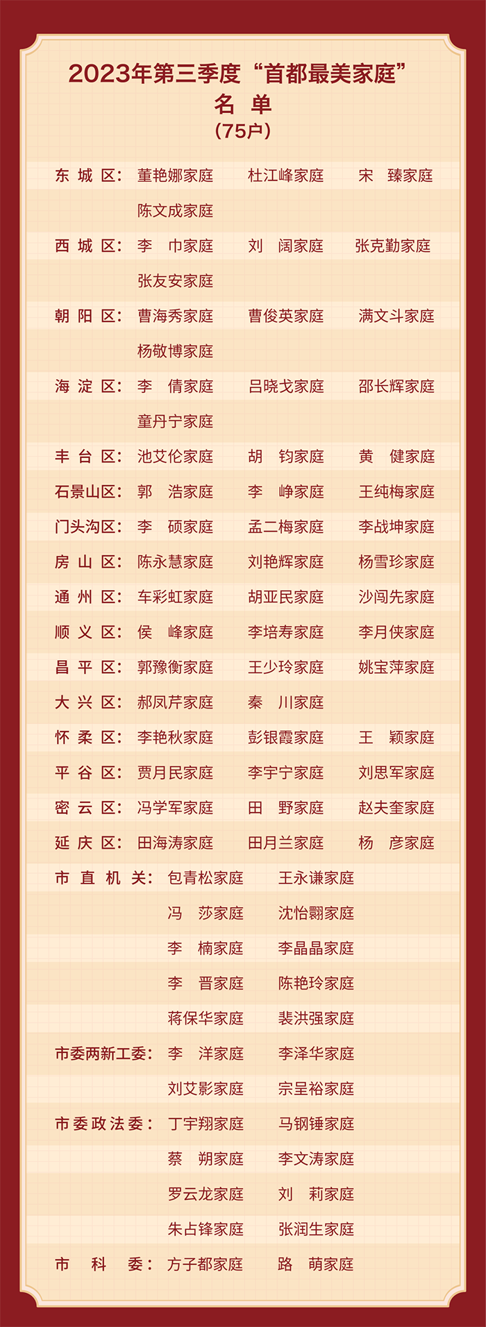Date:2023-11-16 9:34:56 Views:The list of the Capital's Most Beautiful Families for the third quarter of the year 2023 was released recently. The “Looking for the Capital's Most Beautiful Families” campaign was jointly held by the Beijing Municipal Commission for Discipline Inspection, Beijing Municipal Supervisory Commission, the Organization and Publicity departments of Beijing Municipal Committee of the Communist Party of China (CPC), Beijing Municipal Office for Cultural-Ethical Progress, Beijing Municipal Education Commission and Beijing Women's Federation (BWF). The theme for this year is forging ahead with a deeper love of the country on the new journey.