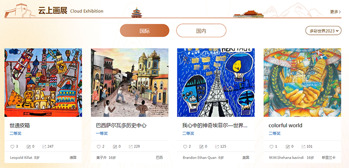 A screenshot of winning Chinese entries at the online exhibition of the 2023 Colorful World International Youth Painting Invitational Exhibition