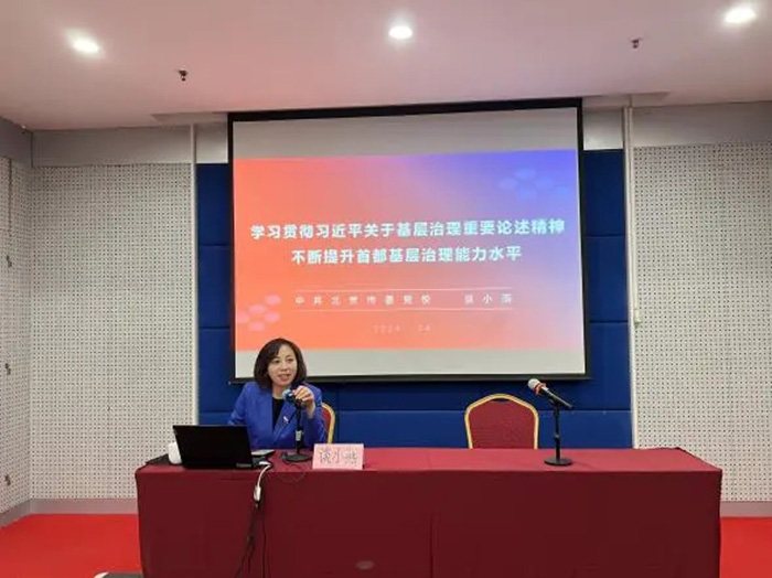Tan Xiaoyan gives a lecture about the study and implementation of the guiding principles of discourses by General Secretary Xi on primary-level governance and about how to bolster primary-level governance capabilities.