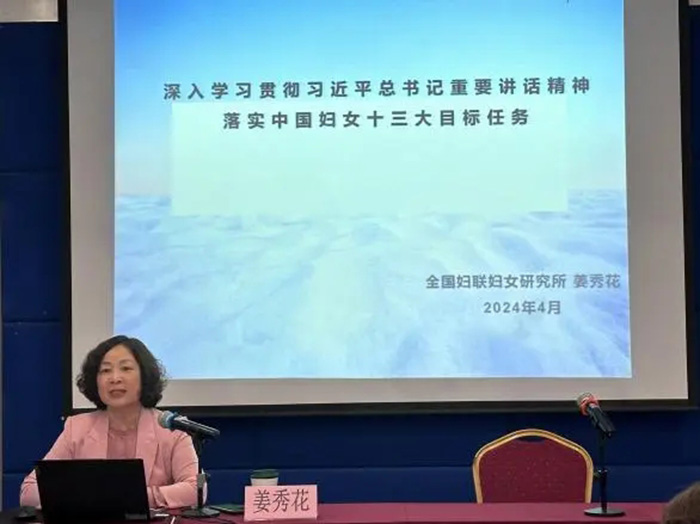 Jiang Xiuhua gives a lecture about the study and implementation of the guiding principles of speeches by General Secretary Xi and the implementation of the goals and tasks set by the 13th NWC.