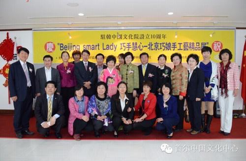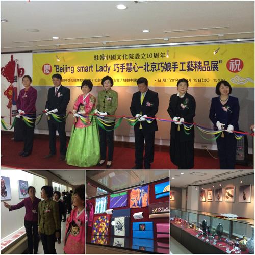 From 15 to 19 October 2014, the Beijing Smart Lady Handicraft Delegation of Beijing Women’s Federation, a party of 10, held the “Skill and Ingenuity – Exhibition of Beijing Smart Lady’s Master Handicrafts” in Seoul of South Korea, and carried out in-depth exchange of views and discussions on how to conduct women’s professional competence training, boost women’s entrepreneurship /employment, hold the “Beijing-Seoul Sisterly Cities’ Women- themed Cultural Exchange” and other subjects with The Chinese Culture Center in Seoul, the Seoul Women’s Entrepreneurship Plaza, and the South Korea-China Cultural and Economic Friendship Association.