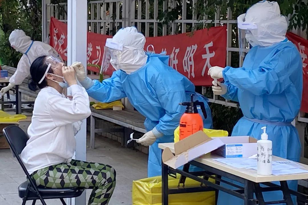 Medical workers braving the scorching heat take a throat swab from a resident for a COVID-19 nucleic acid test in Chaoyang District, Beijing.