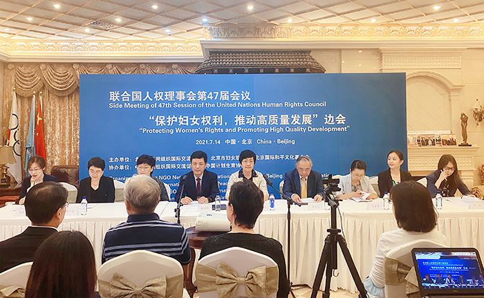 To participate in the agenda under the framework of the United Nations Human Rights Council, enhance China's international right of speech, give full play to the advantages of capital's resources, expand the international influence of women's organizations in Beijing, and promote exchanges and mutual learning among civilizations, Beijing Women's Federation (BWF), the Beijing NGO Network for International Exchanges and the Beijing International Peace Culture Foundation organized on July 14 a side meeting of the 47th Session of the UN Human Rights Council themed on Protecting Women's Rights and Promoting High Quality Development.