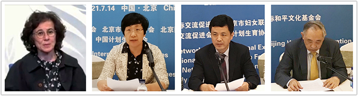 President of British health organization Michelin (L, above), Honorary President of the Beijing Association USA Li Hong (R, above), Chairman of the China African Chamber of Commerce in Mauritius Serin (L, below), and Dutch psychologist and sexologist Sandery address the side meeting via video link on July 14. [Beijing Women's Federation]