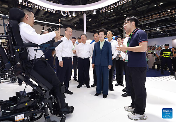 During the event, Shen watched the presentation of homegrown high-tech devices such as robotics with brain-computer interface and exoskeletons. She also took time to learn about the research and application of intelligent wheelchairs and other items.