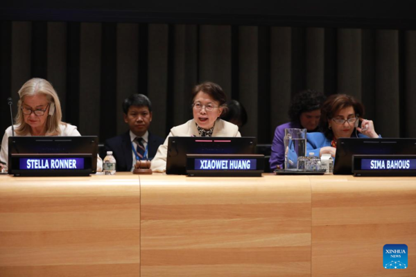Huang Xiaowei (front), Minister and Deputy Head of the National Working Committee on Children and Women of the State Council, speaks at a ministerial roundtable during the 68th session of the Commission on the Status of Women (CSW68) at the UN headquarters in New York, on March 12, 2024. [Xinhua/Li Rui]