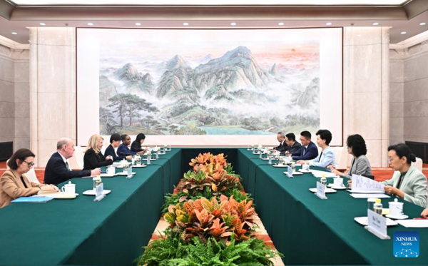 BEIJING, Oct. 15 (Xinhua) — Chinese State Councilor Shen Yiqin met with the United Nations Children's Fund (UNICEF) Executive Director Catherine Russell in Beijing on Monday.